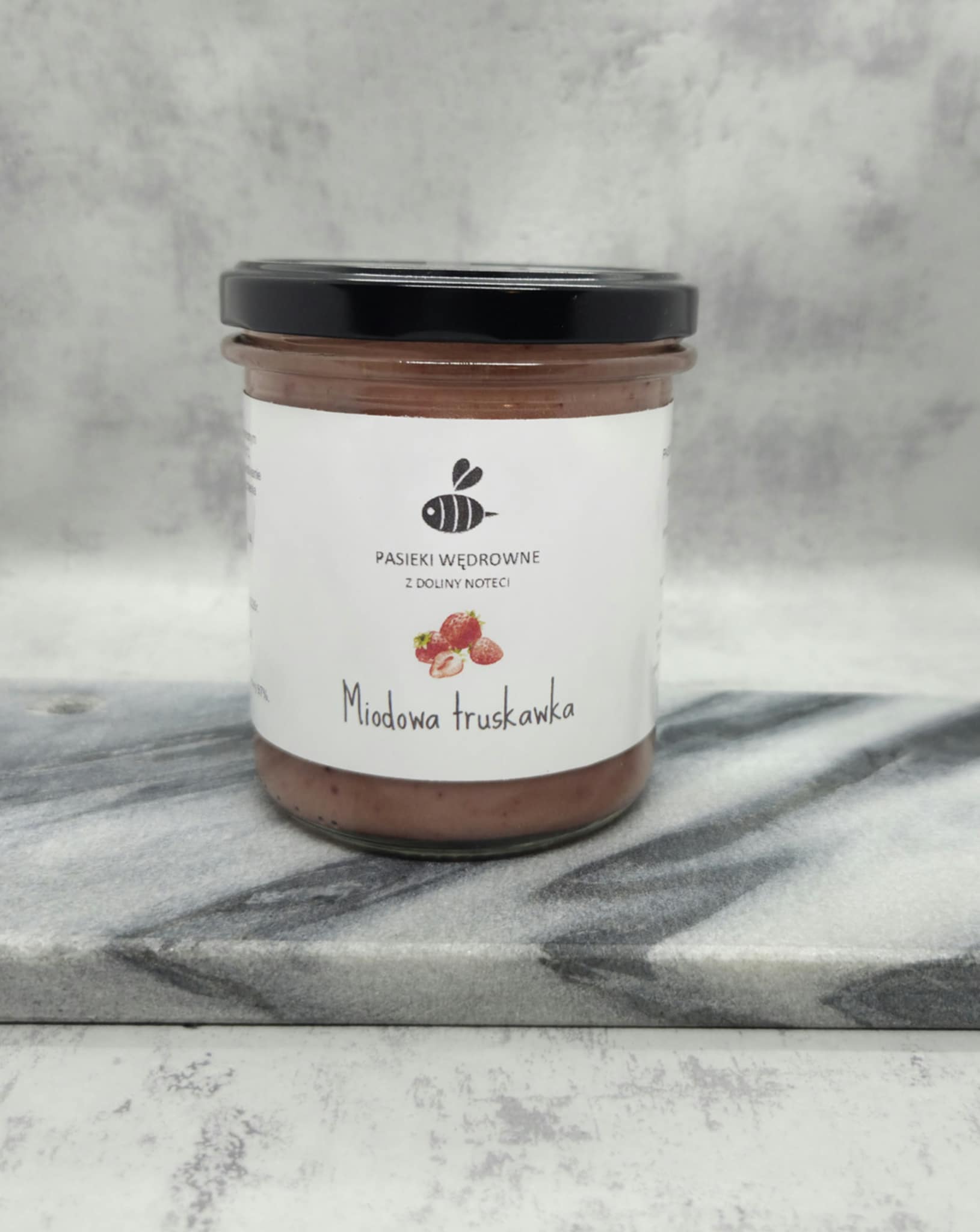 Połączenie miodu wielokwiatowego z truskawkami to smaczna i delikatna kompozycja smakowa. W takim zestawieniu miód zachowuje swoje wartości naturalne i zostaje wzbogacony o smak truskawek. Przypadnie do gustu nawet najmłodszym smakoszom.