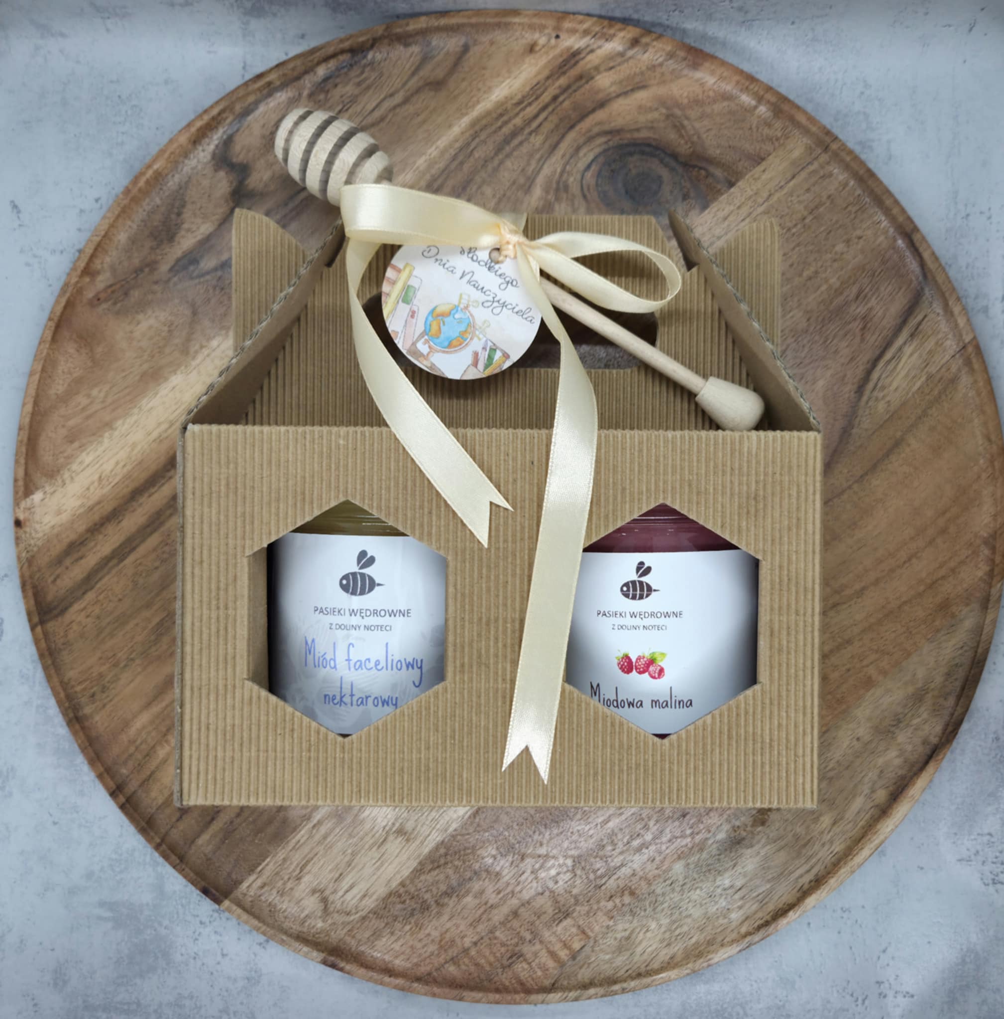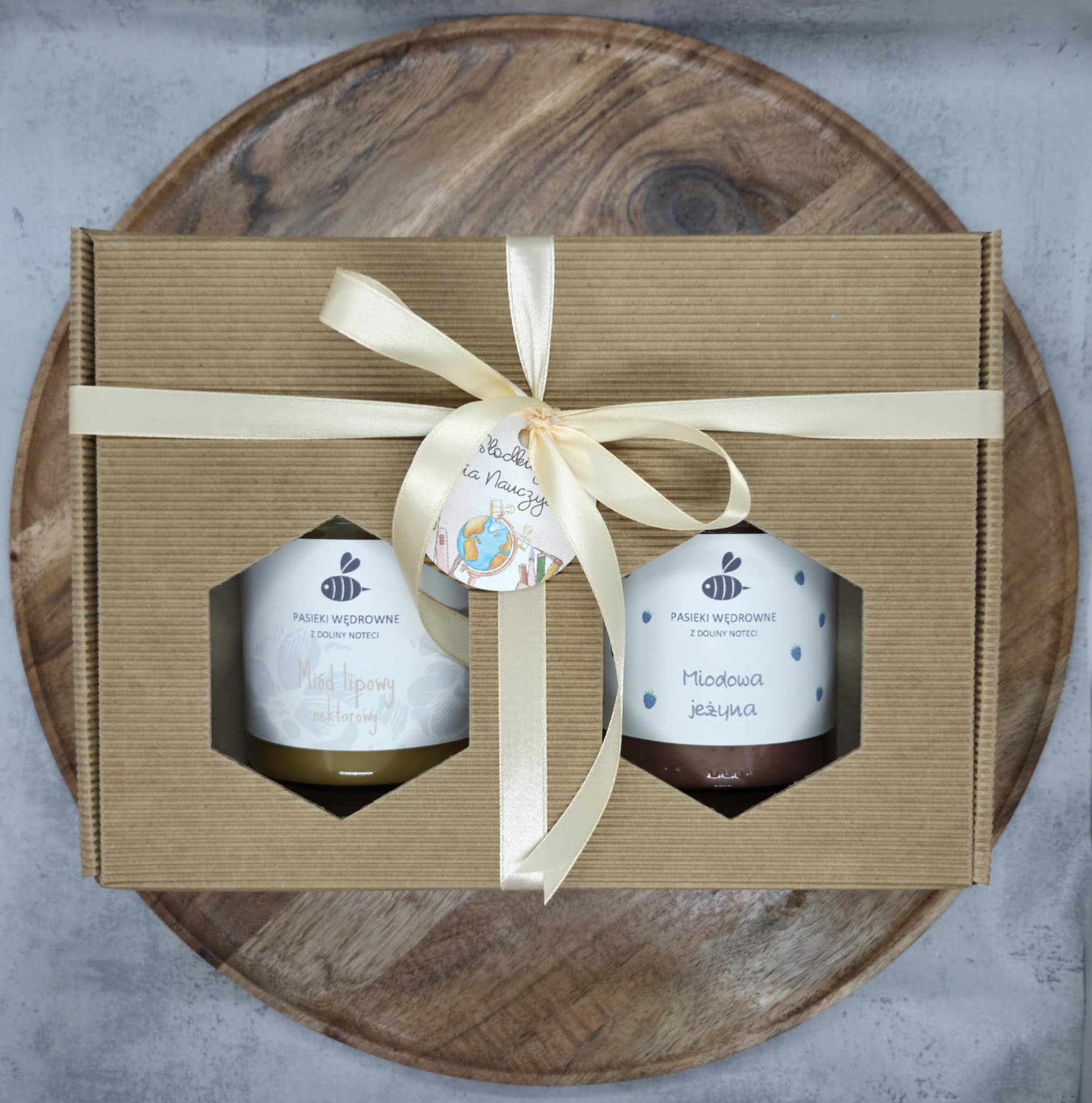 - 2 słoiki miodu z dodatkami 430g lub 2 słoiki miodu tradycyjnego 480g.